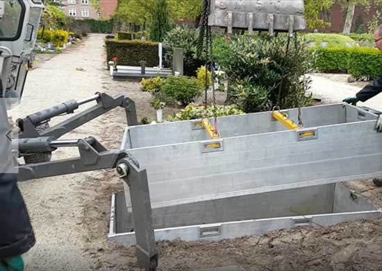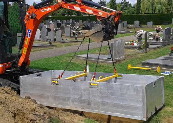 Waarom zou je het moeilijk maken als het makkelijk kan? Om grafbekisting machinaal, veilig, ergonomisch en snel te plaatsen en/of verwijderen hebben wij het tweedelige hijsjuk ontwikkeld. De robuust uitgevoerde en (traploos) in breedte instelbare hijsjukken worden in de handgrepen van de grafbekisting geplaatst en in zijn geheel als ring in het graf gehesen of verwijderd. Dit kan met behulp van de knijper kettingtwee- of viersprong. Extra voordeel; gebruik van hijsjukken verlengt de gebruiksduur van grafbekisting.