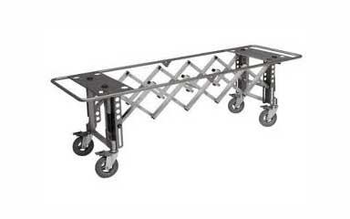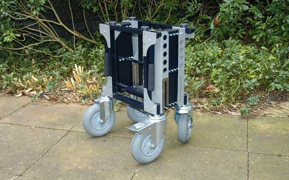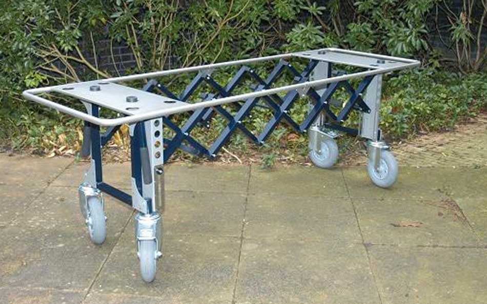 In de rok zijn vier ronde sparingen in de stof aangebracht die over de rubberen noppen vallen. De kist wordt op de noppen geplaatst. Er zijn vier stuks wegklapbare handgrepen aan de schaarwagen gemonteerd. In de rok zijn onzichtbare sparingen aangebracht waardoor de handgrepen kunnen worden uit- en ingeklapt. De wagen is voorzien van vier zwenkbare en te blokkeren wielen (Ø200 mm) met luchtbanden.
